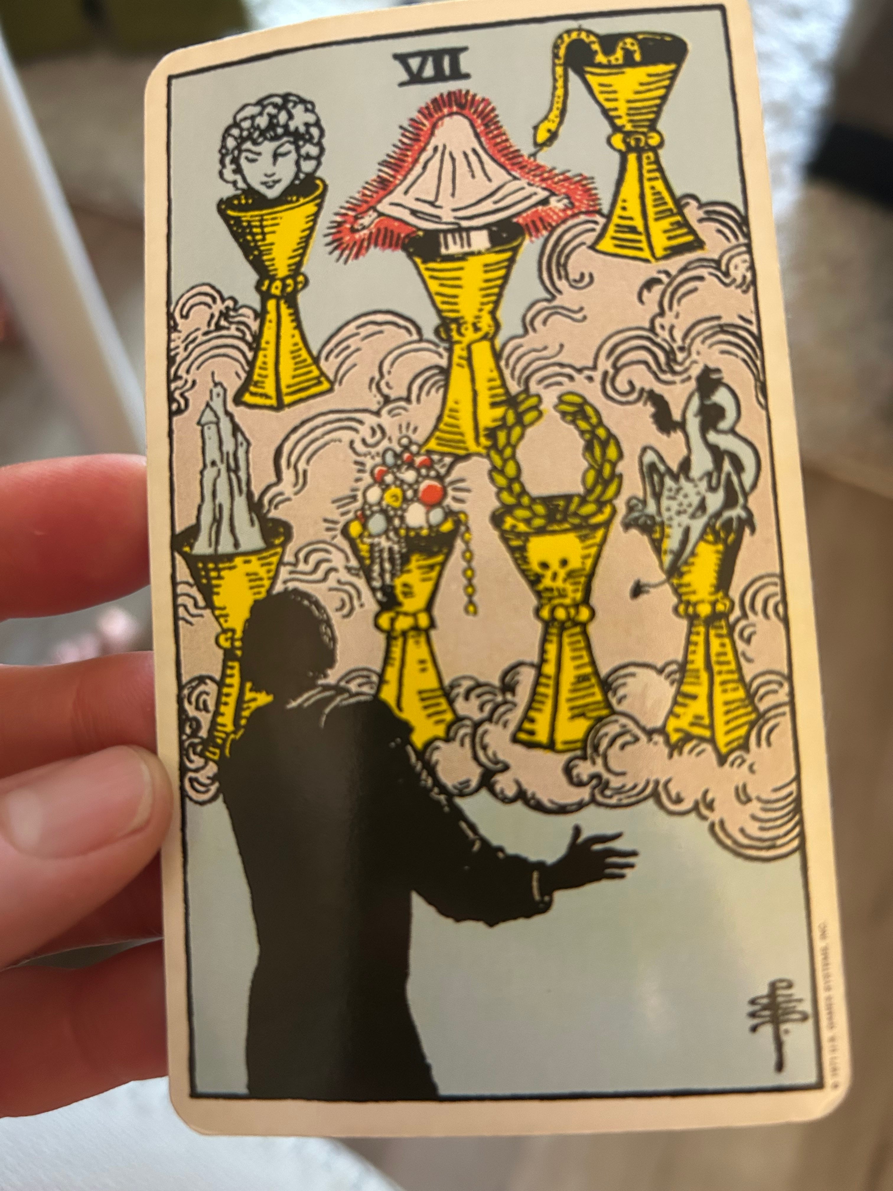 This experience reminds me of the Seven of Cups card from the Tarot. In the Rider–Waite deck, this card shows a shadowy person (me!) looking at seven cups, each filled with an object. I interpret the meaning of this card as all about choices, discernment, confusion, and lack of clarity. Some of the options in the cups are shiny carrot distractions, possibly based on what the ego wants; others are more authentic. You can see the confusion in the body language of this shadowy figure; they seem quite startled. I have felt just like this Seven-of-Cups person the last few months!